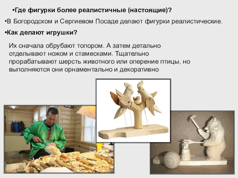 Их сначала обрубают топором. А затем детально отделывают ножом и стамесками. Тщательно прорабатывают шерсть животного или оперение птицы, но выполняются они орнаментально и декоративно