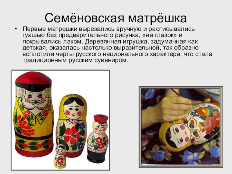 «на глазок» и покрывались лаком. Деревянная игрушка, задуманная как детская, оказалась настолько выразительной, так образно воплотила черты русского национального характера, что стала традиционным русским сувениром.