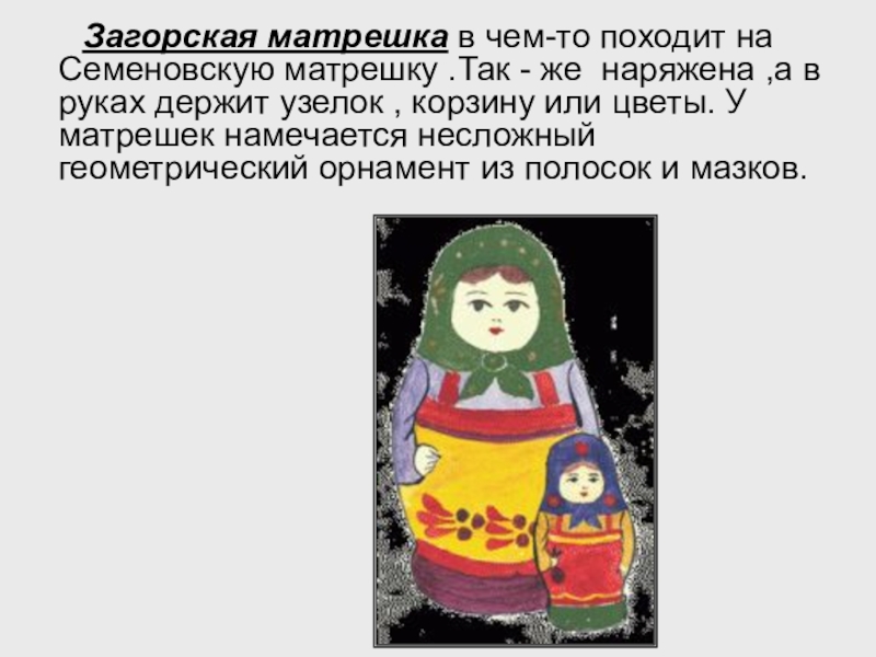 Слайд 8 Загорская матрешка в чем-то походит на Семеновскую матрешку .Так