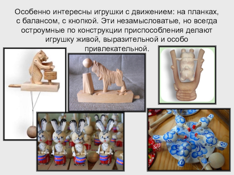 Эти незамысловатые, но всегда остроумные по конструкции приспособления делают игрушку живой, выразительной и особо привлекательной.