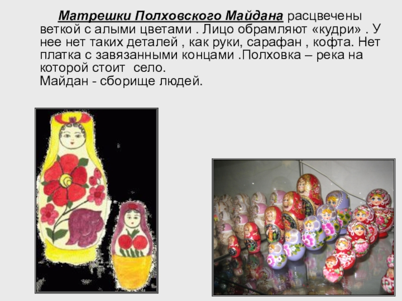 Слайд 4 Матрешки Полховского Майдана расцвечены веткой с алыми цветами