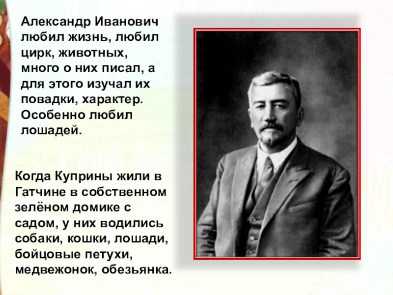 Когда Куприны жили в Гатчине в собственном зелёном домике с садом, у них водились собаки, кошки, лошади, бойцовые петухи, медвежонок, обезьянка.