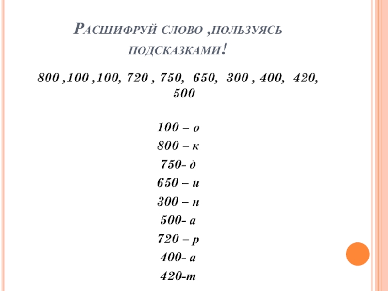 Расшифруй слово ,пользуясь подсказками! 800 ,100 ,100, 720 , 750,  650,  300 , 400,  420, 500 100 – о 800 – к 750- д 650 – и 300 – н 500- а 720 – р400- а 420-т