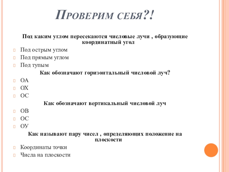 Проверим себя?! Под каким углом пересекаются числовые лучи , образующие координатный угол Под острым угломПод прямым угломПод