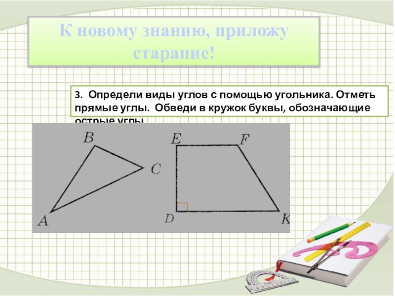 Определи виды углов с помощью угольника. Обведи в кружок буквы, обозначающие острые углы.