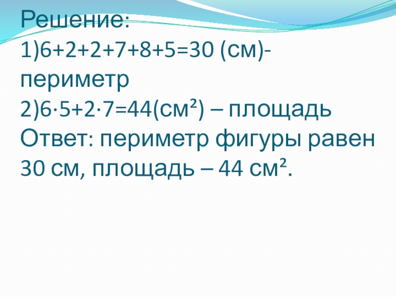 Слайд 8Решение: 1)6+2+2+7+8+5=30 (см)-периметр 2)6∙5+2∙7=44(см²) – площадь Ответ: периметр фигуры равен 30 см, площадь –