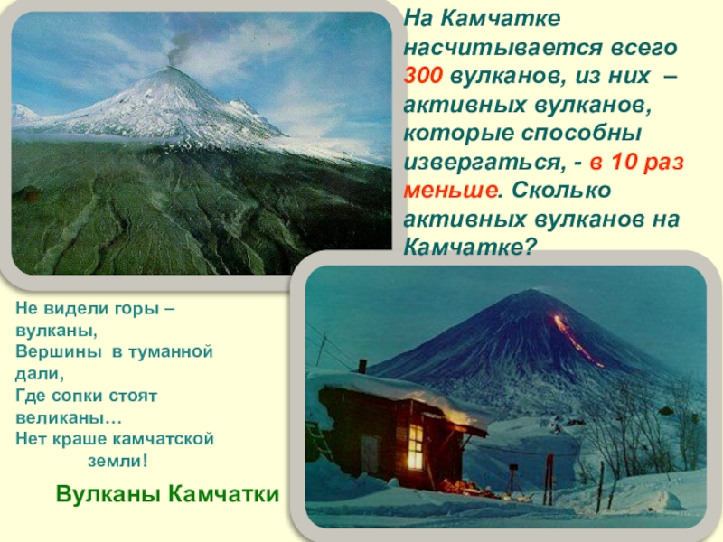 На Камчатке насчитывается всего 300 вулканов, из них – активных вулканов, которые способны извергаться, - в 10 раз меньше. Сколько активных вулканов на Камчатке?