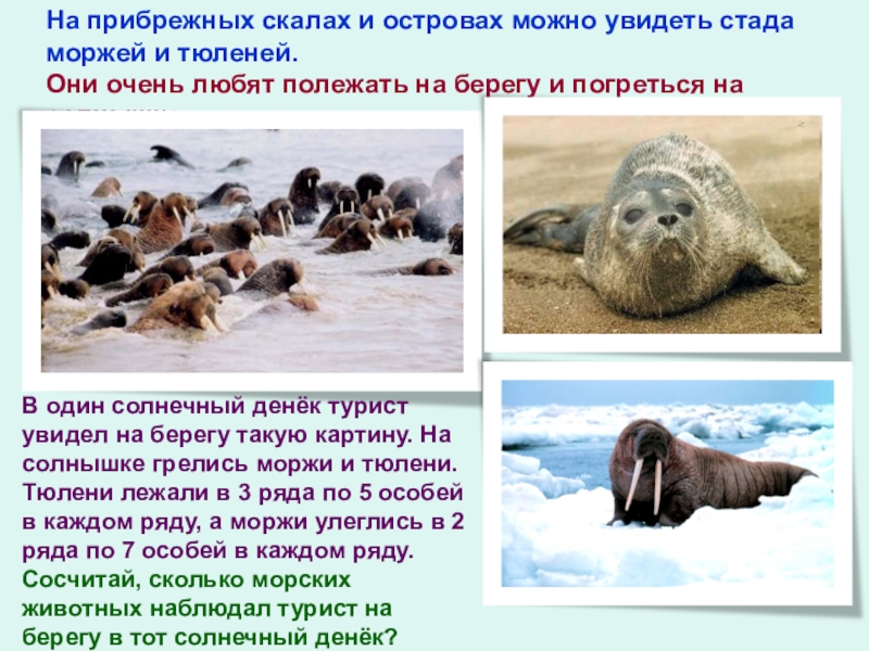 В один солнечный денёк турист увидел на берегу такую картину. На солнышке грелись моржи и тюлени. Тюлени лежали в 3 ряда по 5 особей в каждом ряду, а моржи улеглись в 2 ряда по 7 особей в каждом ряду. Сосчитай, сколько морских животных наблюдал турист на берегу в тот солнечный денёк?