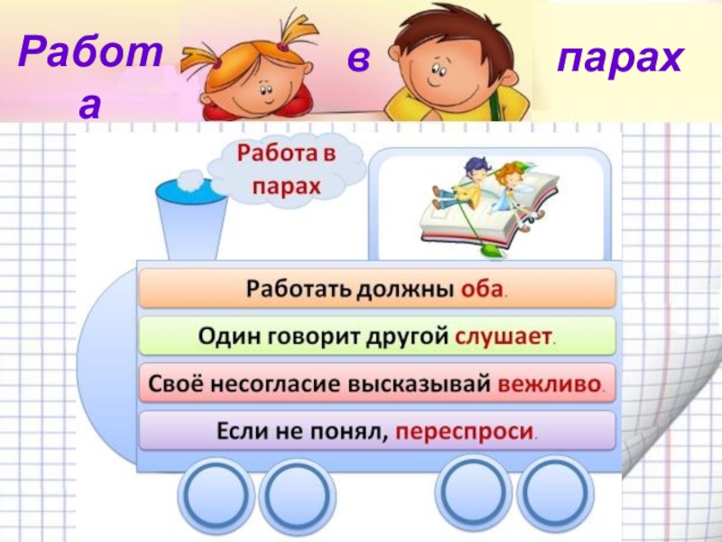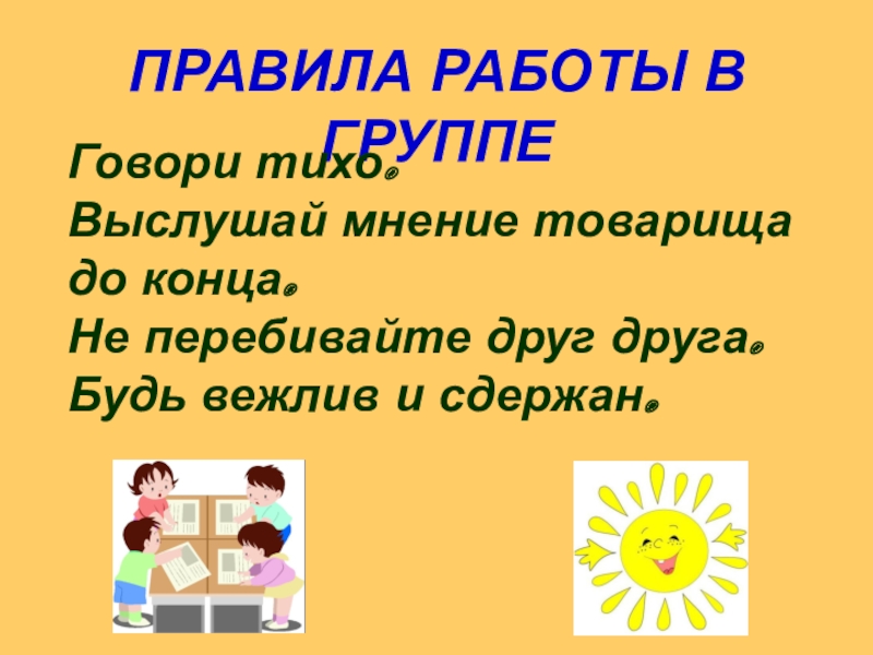 ПРАВИЛА РАБОТЫ В ГРУППЕГовори тихо.Выслушай мнение товарища до конца.Не перебивайте друг друга.Будь вежлив и сдержан.
