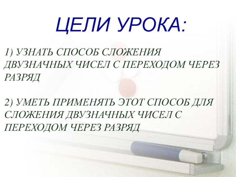 ЦЕЛИ УРОКА:1) УЗНАТЬ СПОСОБ СЛОЖЕНИЯ ДВУЗНАЧНЫХ ЧИСЕЛ С ПЕРЕХОДОМ ЧЕРЕЗ РАЗРЯД2) УМЕТЬ ПРИМЕНЯТЬ ЭТОТ СПОСОБ ДЛЯ СЛОЖЕНИЯ