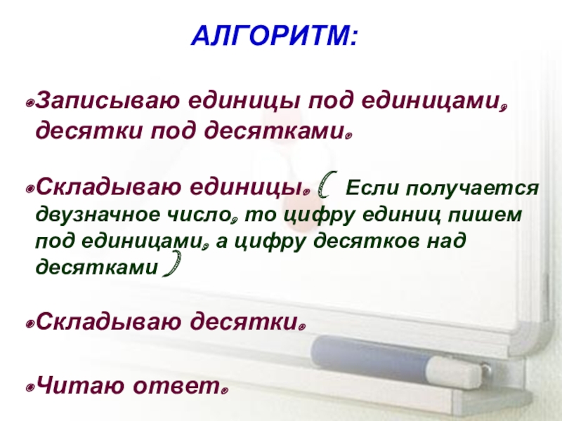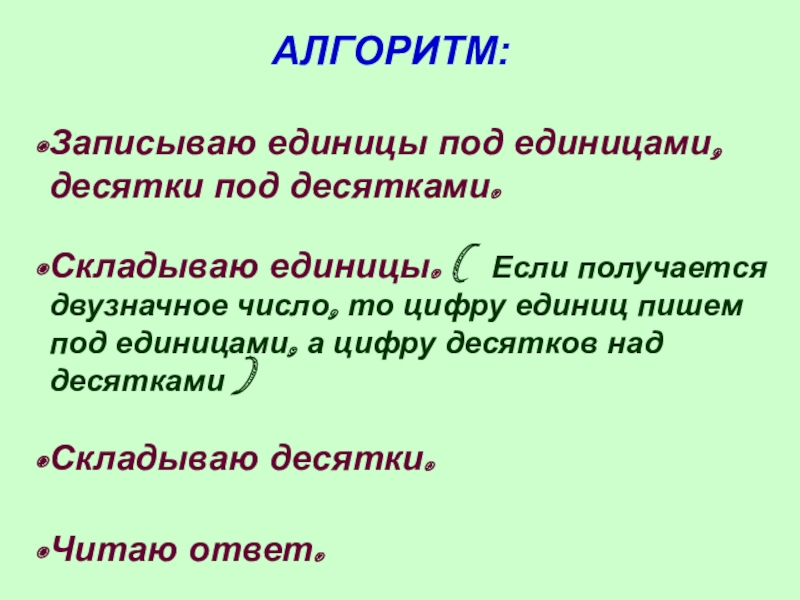 АЛГОРИТМ:Записываю единицы под единицами, десятки под десятками.Складываю единицы. ( Если получается двузначное число, то цифру единиц пишем