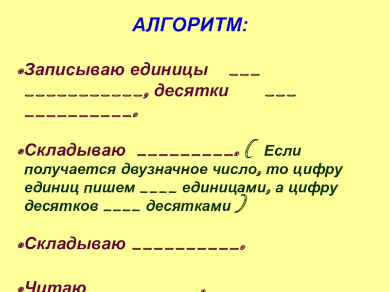 Складываю _________. ( Если получается двузначное число, то цифру единиц пишем ____ единицами, а цифру десятков ____ десятками )