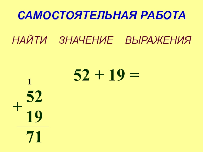 САМОСТОЯТЕЛЬНАЯ РАБОТАНАЙТИ  ЗНАЧЕНИЕ  ВЫРАЖЕНИЯ52 + 19 =521971+1