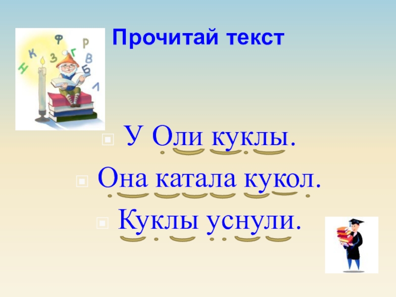 Прочитай текстУ Оли куклы.Она катала кукол.Куклы уснули.