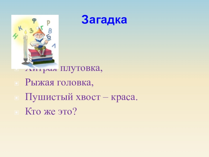ЗагадкаХитрая плутовка,Рыжая головка,Пушистый хвост – краса.Кто же это?