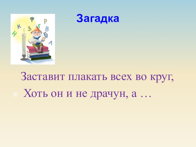 Загадка Заставит плакать всех во круг, Хоть он и не драчун, а …