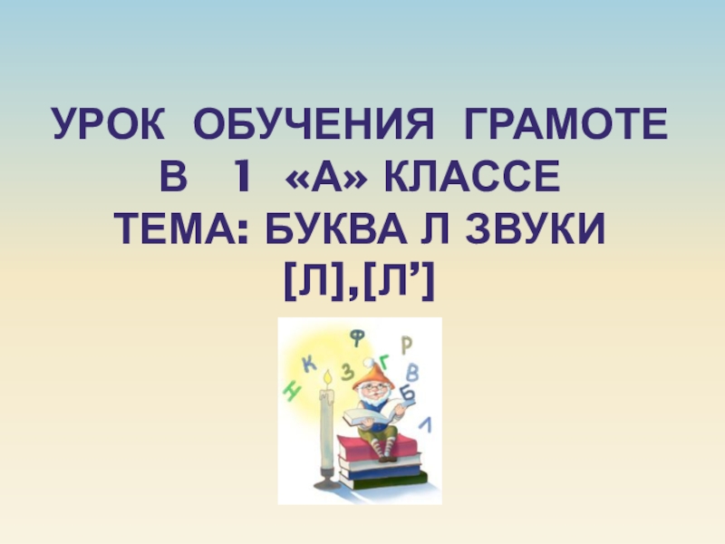 Слайд 1УРОК ОБУЧЕНИЯ ГРАМОТЕ В 1 «А» КЛАССЕ ТЕМА: БУКВА Л ЗВУКИ