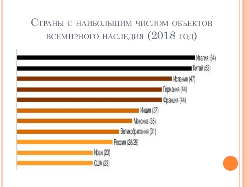 Слайд 19Страны с наибольшим числом объектов всемирного наследия (2018 год)