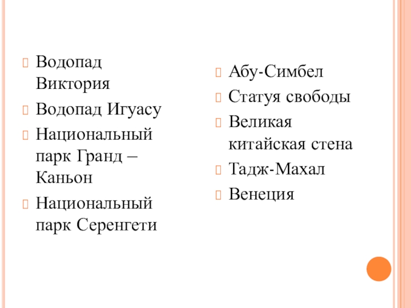 Абу-Симбел Статуя свободыВеликая китайская стена Тадж-МахалВенецияВодопад ВикторияВодопад ИгуасуНациональный парк Гранд –Каньон Национальный парк Серенгети