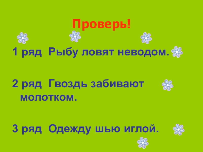 Проверь!1 ряд Рыбу ловят неводом.2 ряд Гвоздь забивают молотком. 3 ряд Одежду шью иглой.