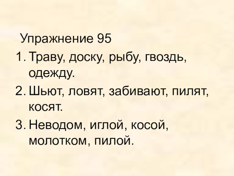Упражнение 95Траву, доску, рыбу, гвоздь, одежду.Шьют, ловят, забивают, пилят, косят.Неводом, иглой, косой, молотком, пилой.