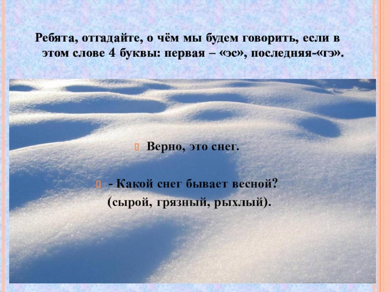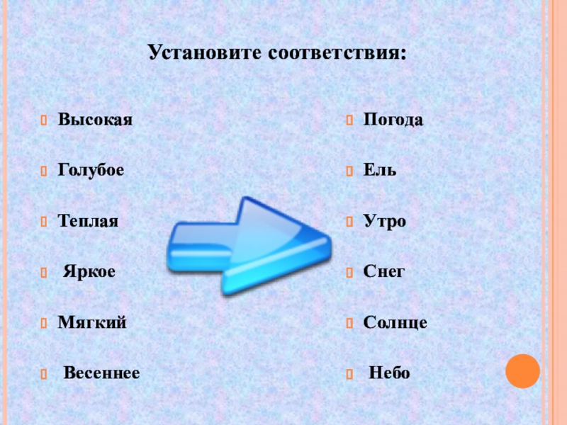 - для учителя , предметные картинки (ведро, ель, семья, незнайка, апельсин; солнце, облака, птицы, снег), карточки-таблички со словами (весна; греет, светит, радует; острые, блестящие, прозрачные, безоблачное, чистое, голубое, сырой, грязный, рыхлый), набор карточек «Признаки весны», .