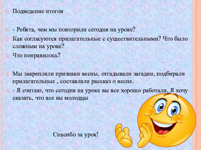- Я считаю, что сегодня на уроке вы все хорошо работали. Я хочу сказать, что все вы молодцы
