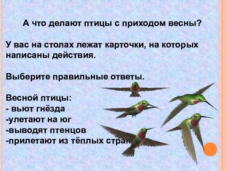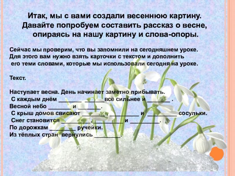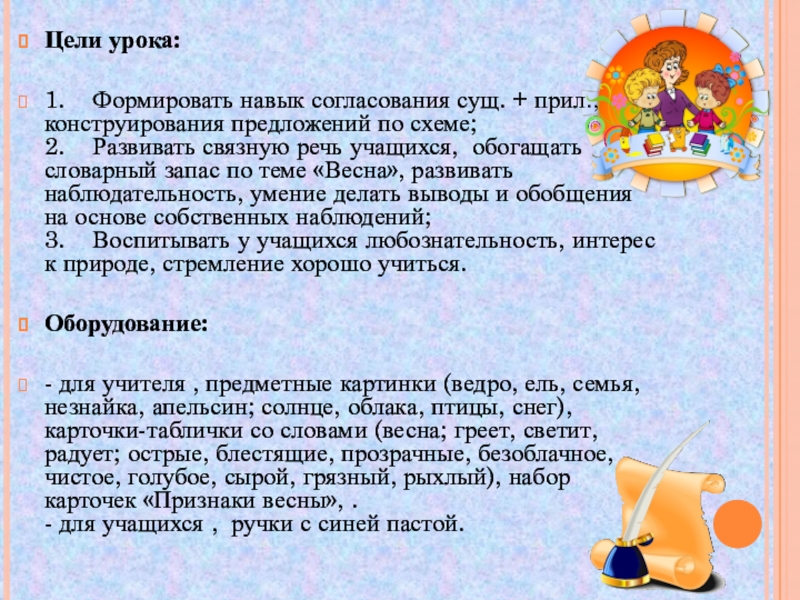 2. Развивать связную речь учащихся, обогащать словарный запас по теме «Весна», развивать наблюдательность, умение делать выводы и обобщения на основе собственных наблюдений;