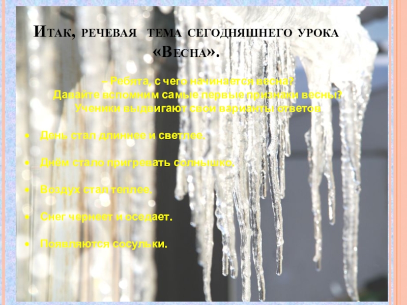 Слайд 5Итак, речевая тема сегодняшнего урока «Весна».