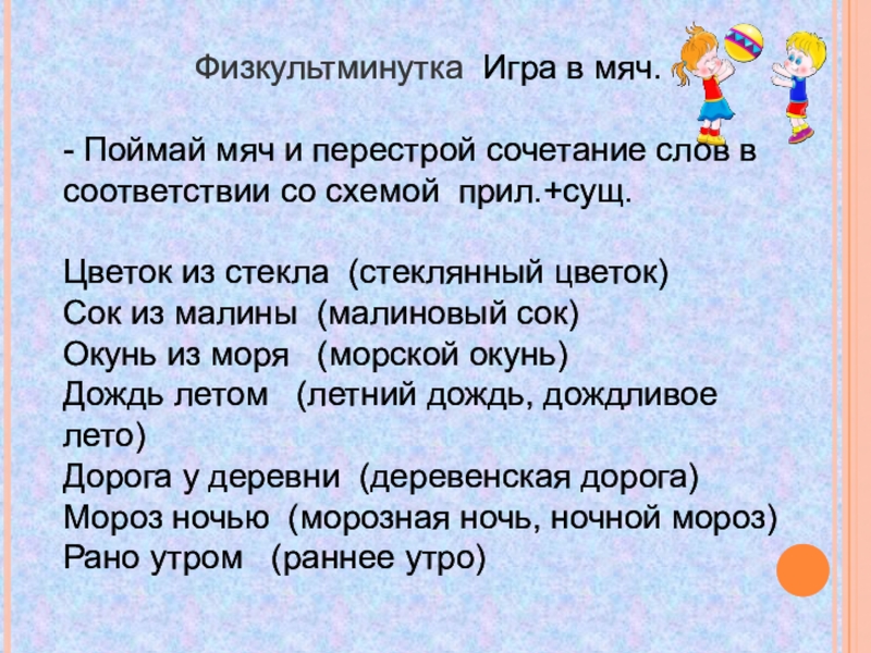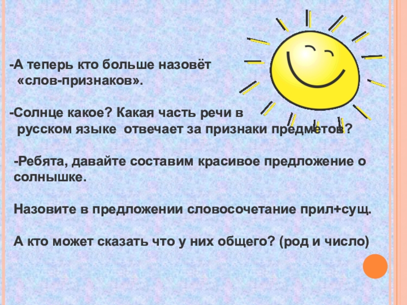 1. Формировать навык согласования сущ. + прил., конструирования предложений по