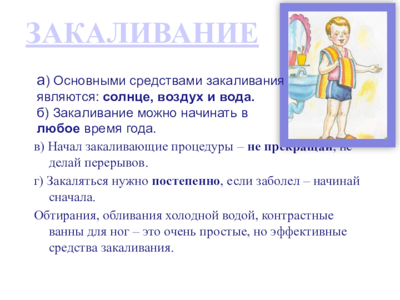 а) Основными средствами закаливания являются: солнце, воздух и вода.