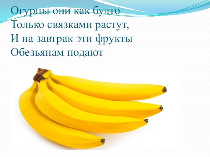 Слайд 13Огурцы они как будто Только связками растут, И на завтрак эти фрукты Обезьянам подают