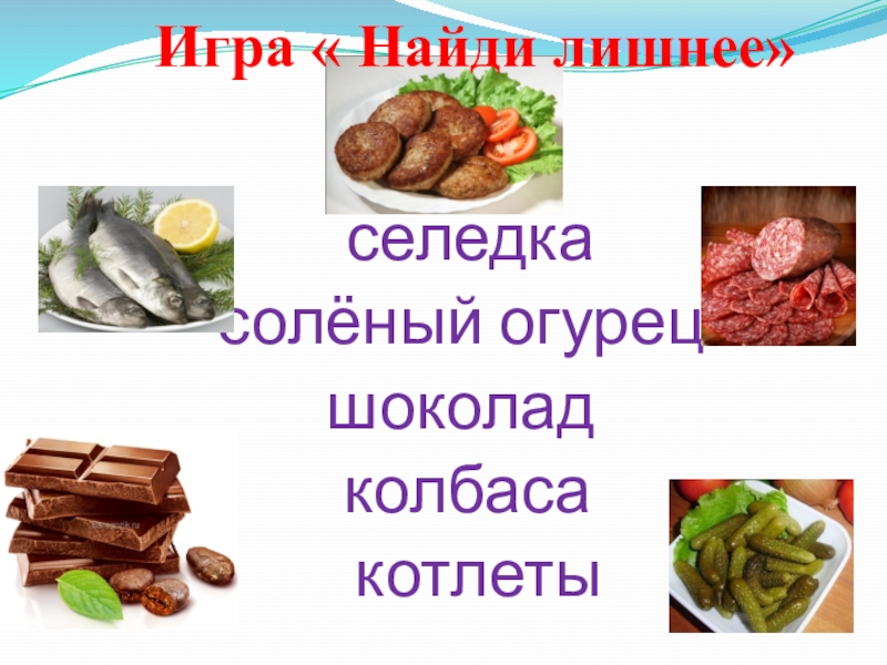 Игра « Найди лишнее»        селедка котлетысолёный огурецшоколадколбаса