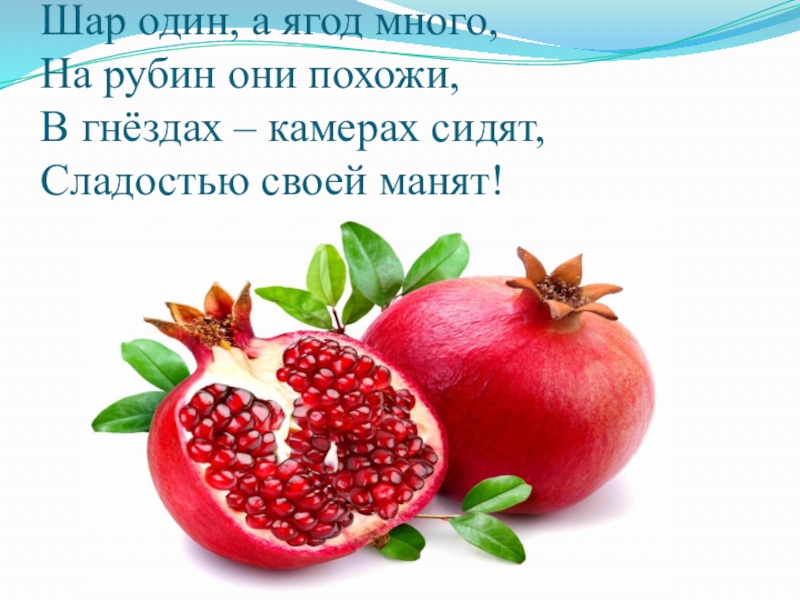 Шар один, а ягод много, На рубин они похожи,  В гнёздах – камерах сидят,  Сладостью