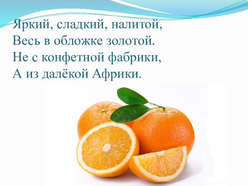Слайд 10Яркий, сладкий, налитой,  Весь в обложке золотой.  Не с конфетной фабрики,  А из далёкой