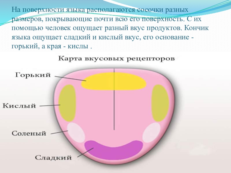 поверхность. С их помощью человек ощущает разный вкус продуктов. Кончик языка ощущает сладкий и кислый вкус, его основание - горький, а края - кислы .