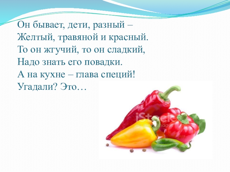 Он бывает, дети, разный – Желтый, травяной и красный. То он жгучий, то он сладкий, Надо знать