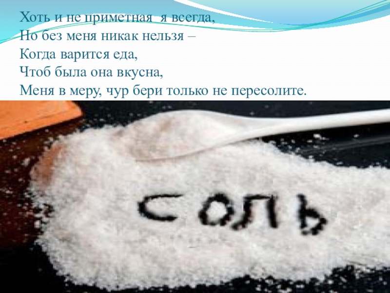 – Когда варится еда, Чтоб была она вкусна, Меня в меру, чур бери только не пересолите.