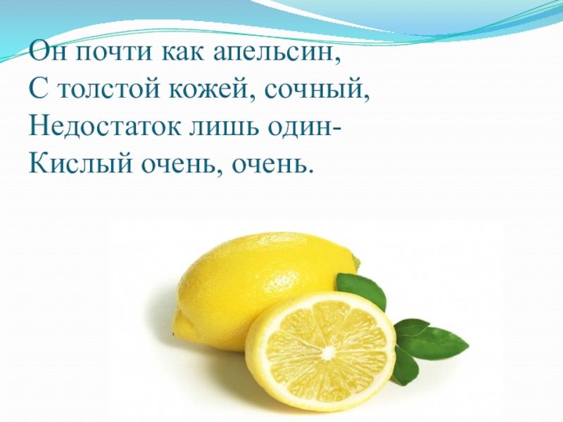 Слайд 4Он почти как апельсин, С толстой кожей, сочный, Недостаток лишь один- Кислый очень, очень.