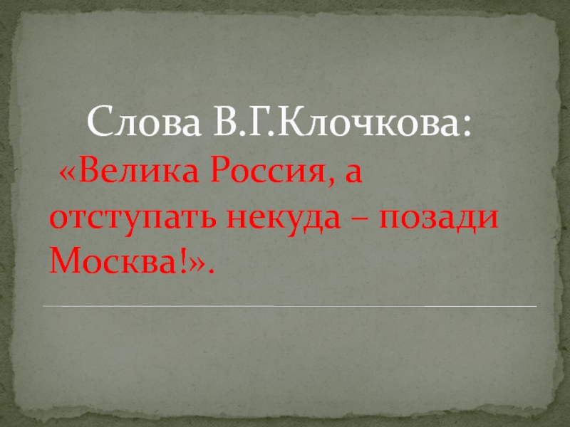 Слайд 26 Слова В.Г.Клочкова: «Велика Россия, а отступать некуда – позади