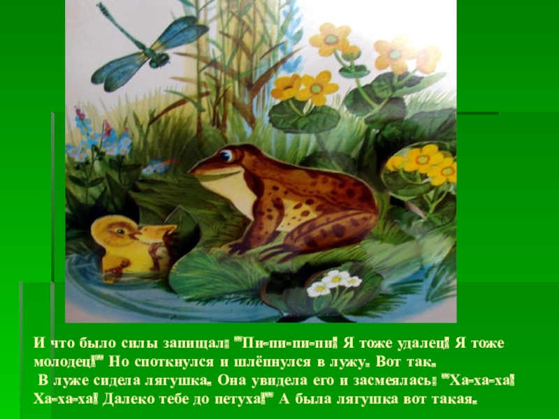 молодец!" Но споткнулся и шлёпнулся в лужу. Вот так. В луже сидела лягушка. Она увидела его и засмеялась: "Ха-ха-ха! Ха-ха-ха! Далеко тебе до петуха!" А была лягушка вот такая.