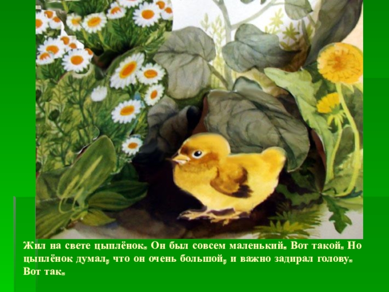 Жил на свете цыплёнок. Он был совсем маленький. Вот такой. Но цыплёнок думал, что он очень большой,