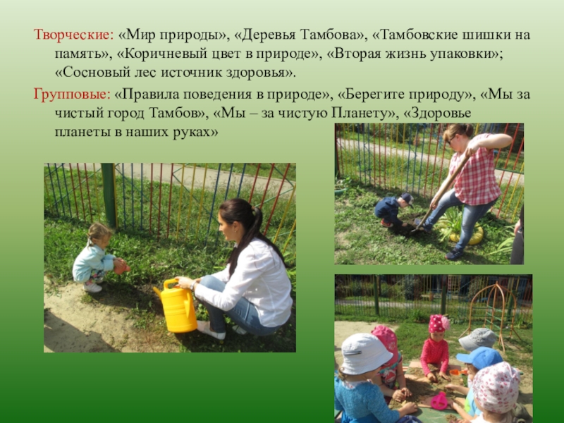 Групповые: «Правила поведения в природе», «Берегите природу», «Мы за чистый город Тамбов», «Мы – за чистую Планету», «Здоровье планеты в наших руках»