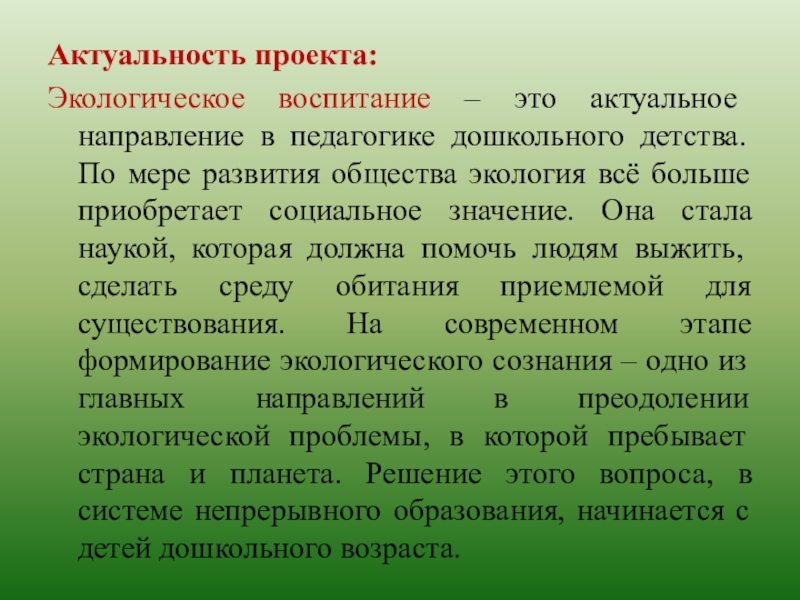 детства. По мере развития общества экология всё больше приобретает социальное значение. Она стала наукой, которая должна помочь людям выжить, сделать среду обитания приемлемой для существования. На современном этапе формирование экологического сознания – одно из главных направлений в преодолении экологической проблемы, в которой пребывает страна и планета. Решение этого вопроса, в системе непрерывного образования, начинается с детей дошкольного возраста.