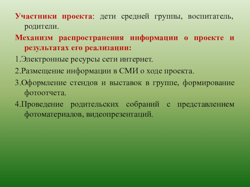 Слайд 7Участники проекта: дети средней группы, воспитатель, родители.
