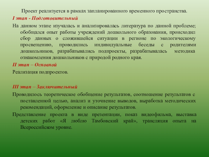 этапе изучалась и анализировалась литература по данной проблеме; обобщался опыт работы учреждений дошкольного образования, происходил сбор данных о сложившейся ситуации в регионе по экологическому просвещению, проводились индивидуальные беседы с родителями дошкольников, разрабатывались подпроекты, разрабатывалась методика ознакомления дошкольников с природой родного края.