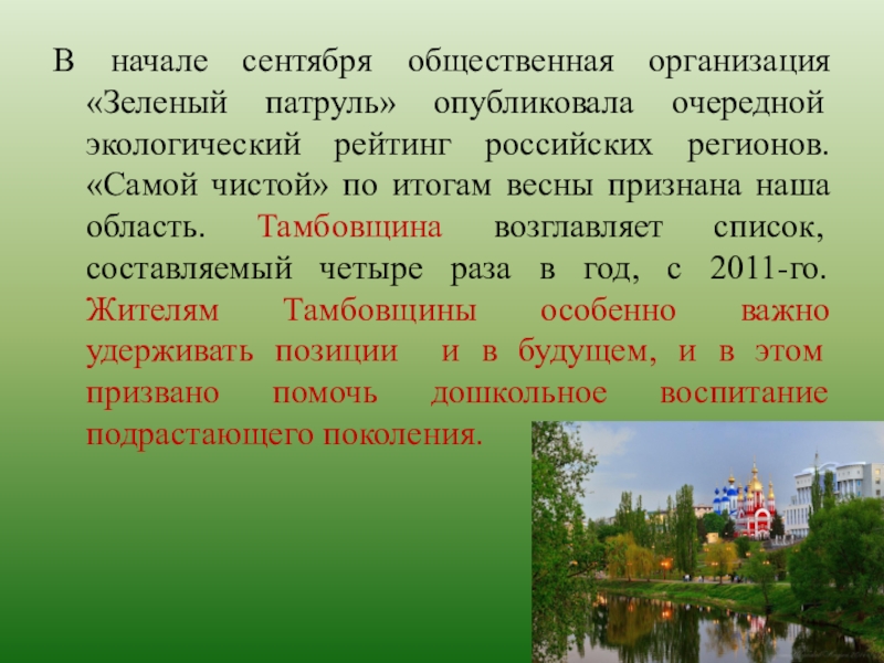 российских регионов. «Самой чистой» по итогам весны признана наша область. Тамбовщина возглавляет список, составляемый четыре раза в год, с 2011-го. Жителям Тамбовщины особенно важно удерживать позиции и в будущем, и в этом призвано помочь дошкольное воспитание подрастающего поколения.