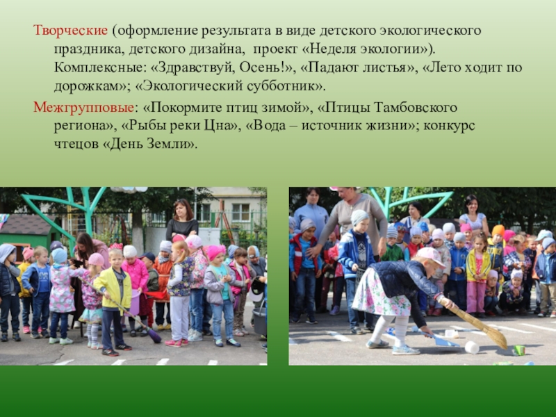 «Неделя экологии»). Комплексные: «Здравствуй, Осень!», «Падают листья», «Лето ходит по дорожкам»; «Экологический субботник».