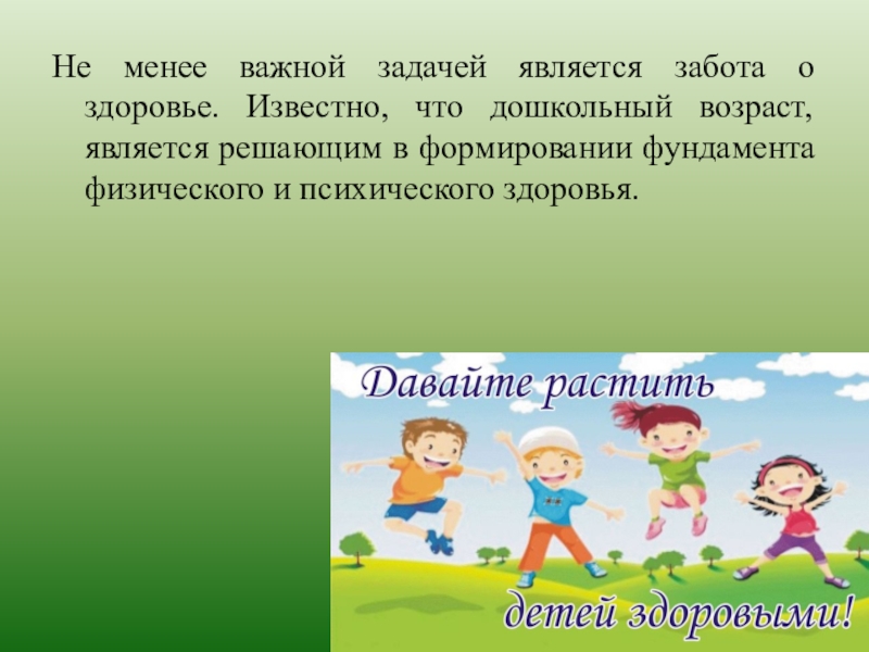 Слайд 5Не менее важной задачей является забота о здоровье. Известно, что дошкольный