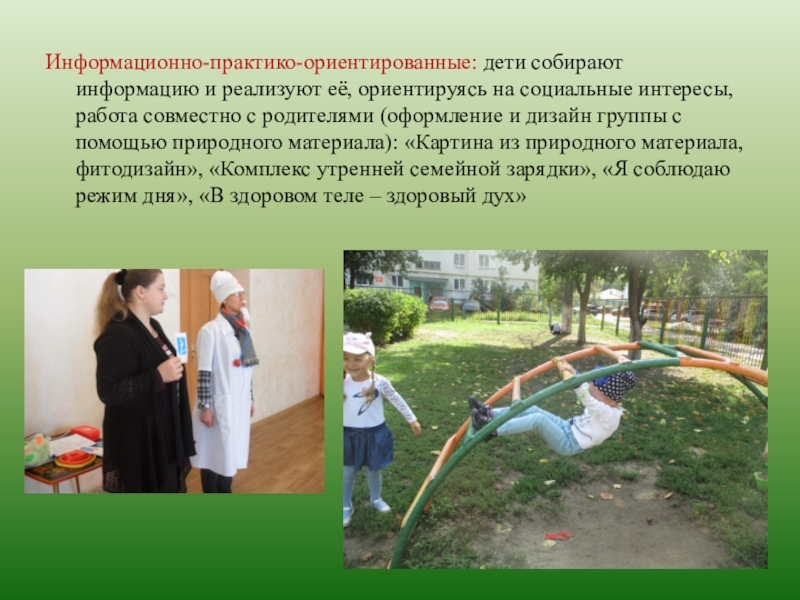 Слайд 10Информационно-практико-ориентированные: дети собирают информацию и реализуют её, ориентируясь на социальные интересы,